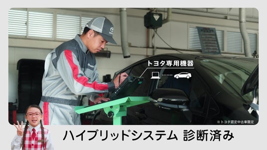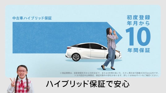 中古車のハイブリッドカー特有の不安を解消する内容にフォーカス。豊富な在庫、ハイブリッド機構の無償保証(※2)、トヨタ専用機器によるハイブリッドシステム診断(※3)など、トヨタだからこそ提供できる“確かな品質”を描き、「ハイブリッドカーを選ぶならトヨタのお店の中古車」を紹介しています。