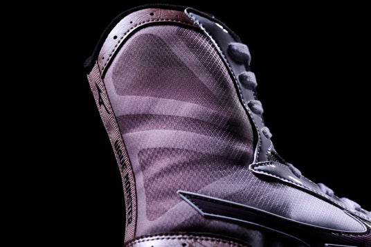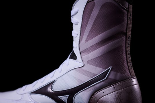前足部からかかと部にかけてグラデーションを施し、これまでのボクシングシューズにはない新しいカラーブロックを表現しています。特に履き口部分には、透け感のあるメッシュ材を採用し、補強材を挟み込む構造で、柔軟性や軽量性といったボクサーに求められる機能を実現すると同時に、井上尚弥選手をはじめとする世界に挑戦するボクサーの内面からにじみ出る強さも表現しています。