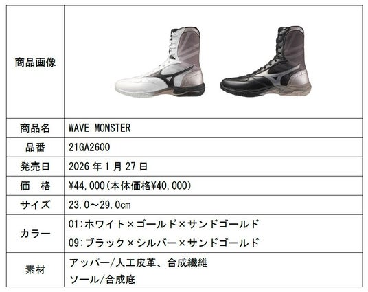 ミズノは、プロボクサー井上尚弥選手と共同開発した「WAVE MONSTER(ウエーブ モンスター)」を2026年1月27日にミズノ直営店、ミズノ公式オンラインで発売します。また、韓国とヨーロッパのミズノ直営店でも同時発売します。