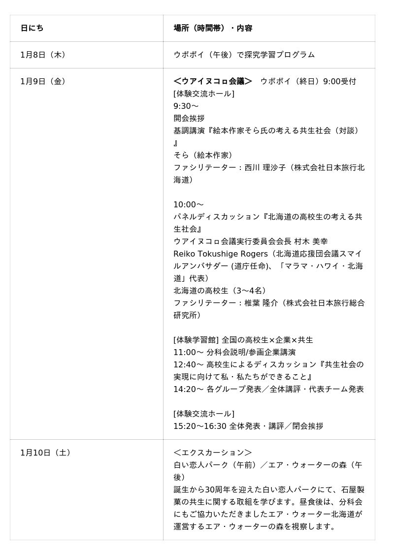 - 昨年の開催では、全国から集った高校生はウアイヌコㇿ会議の当日だけではなく、前日までの事前学習や翌日のエクスカーション、事後学習を通して交流や議論を行いました。