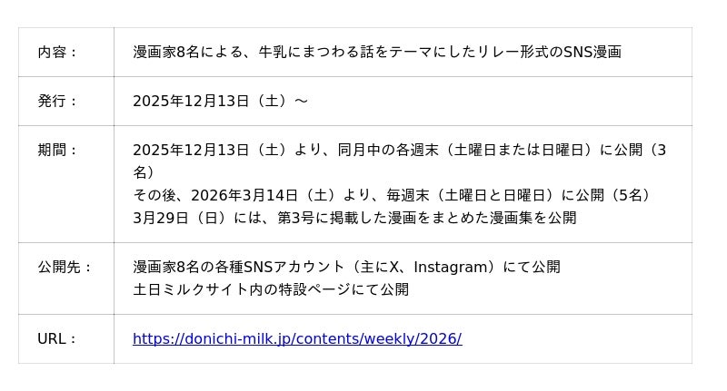 第1号を2023年秋、第2号を2024年の年度末に発行し、好評をいただいてきた企画です。第3号では、SNSで人気の漫画家8名が、冬休み・年末(2025年12月中~下旬)および春休み(2026年3月中~下旬)の2シーズンに分かれて、毎週末(土曜日または日曜日)に1名ずつ、“牛乳にまつわる漫画”をリレー形式で投稿していきます。題材は、これまで通り、国産の牛乳・乳製品と酪農をテーマに、バラエティー豊かな内容でお届けいたします。