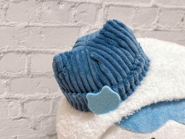 ぬいぐるみの素材はポリエステル。開封してまず感動したのが、場所によって異素材が用いられている点です。ゆきだるまの部分はループ状のボア生地で、ハチワレのお顔は毛足の短いふわもこ生地。この素材の違いがかわいさを生み出しています。