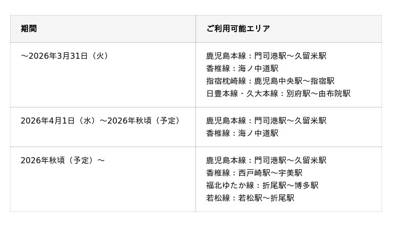 本格導入に際し対象エリアを変更いたします。鹿児島地区の指宿枕崎線および大分地区の日豊本線・久大本線での利用を終了し、新たに2026年秋頃(予定)から福岡地区の香椎線・福北ゆたか線・若松線を追加いたします。計92駅での利用が可能となります。