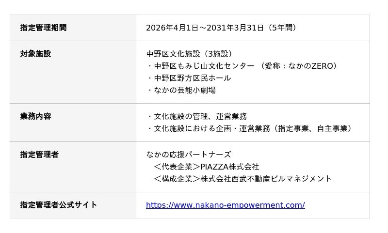 なお、中野区文化施設の指定管理者の変更は、2006年4月から指定管理者制度が導入されて以来初となり、PIAZZAが指定管理者として公共施設の管理・運営を行うことも初めてとなります。
