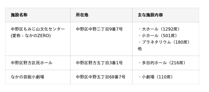 「中野区もみじ山文化センター (愛称:なかのZERO)」は、中野区の文化芸術の振興と区民の生涯学習の推進を図ることを目的に、また、「中野区野方区民ホール」及び「なかの芸能小劇場」は区民に文化活動や芸術鑑賞等の場を提供し、地域文化の振興を図ることを目的として設置された施設です。昨年度は約98万人※が利用しています。