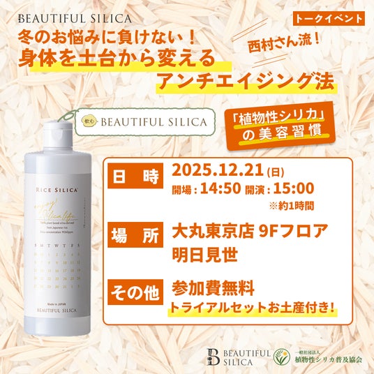 F.I.S.株式会社(本社:東京都渋谷区、代表取締役:石川淳)は、2025年3月に立ち上げた植物性シリカ配合ブランド「BEAUTIFUL SILICA」のスペシャルトークイベントを、2025年12月21日(日)に大丸東京店 9F「明日見世(asumise)」にて開催いたします。