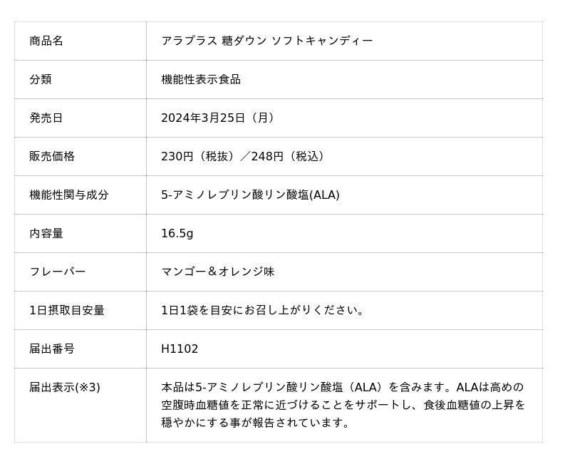 ※2 5-ALAを機能性関与成分とした菓子タイプの機能性表示食品として業界初(消費者庁機能性表示食品データベースに基づく:2024年3月SBIアラプロモ調べ)
