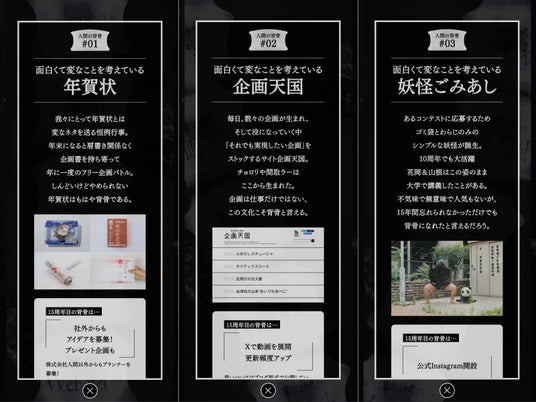 今回のWebサイトでは、“人間らしさ”を「面白くて変なことを考えている◯◯◯」という形で表現し、1年をかけてその項目を「背骨」として一つずつ追加していく予定です。例えば、「面白くて変なことを考えている 年賀状」では、毎年恒例となっている弊社の異常に手の込んだ年賀状を紹介し、15周年となる今年はどのような工夫を凝らすのかを解説します。