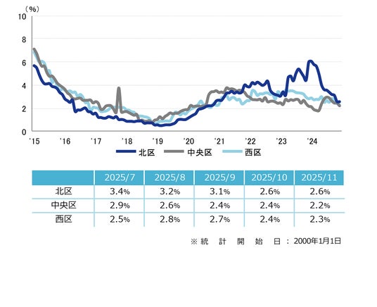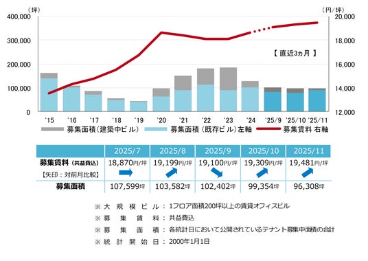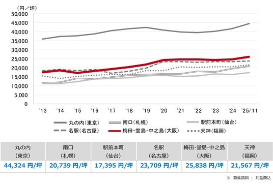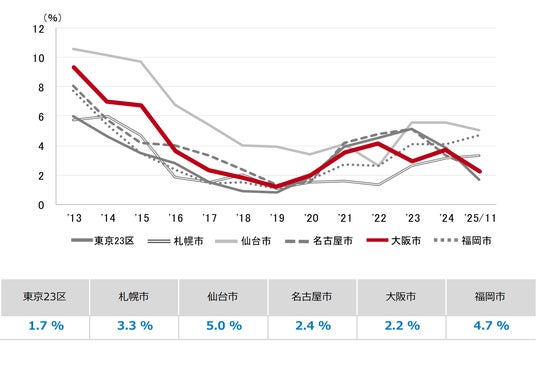 三幸エステート株式会社(本社:東京都中央区、取締役社長:福島正二郎)は、2025年11月度の大阪市オフィス賃貸状況(空室率&現空面積:大規模、募集賃料&募集面積:大規模、規模別空室率、主要3区※1空室率:大規模)および全国6大都市(東京・札幌・仙台・名古屋・大阪・福岡)の大規模ビルのマーケットデータをまとめた「オフィスマーケット2025年12月号大阪」を公表します。