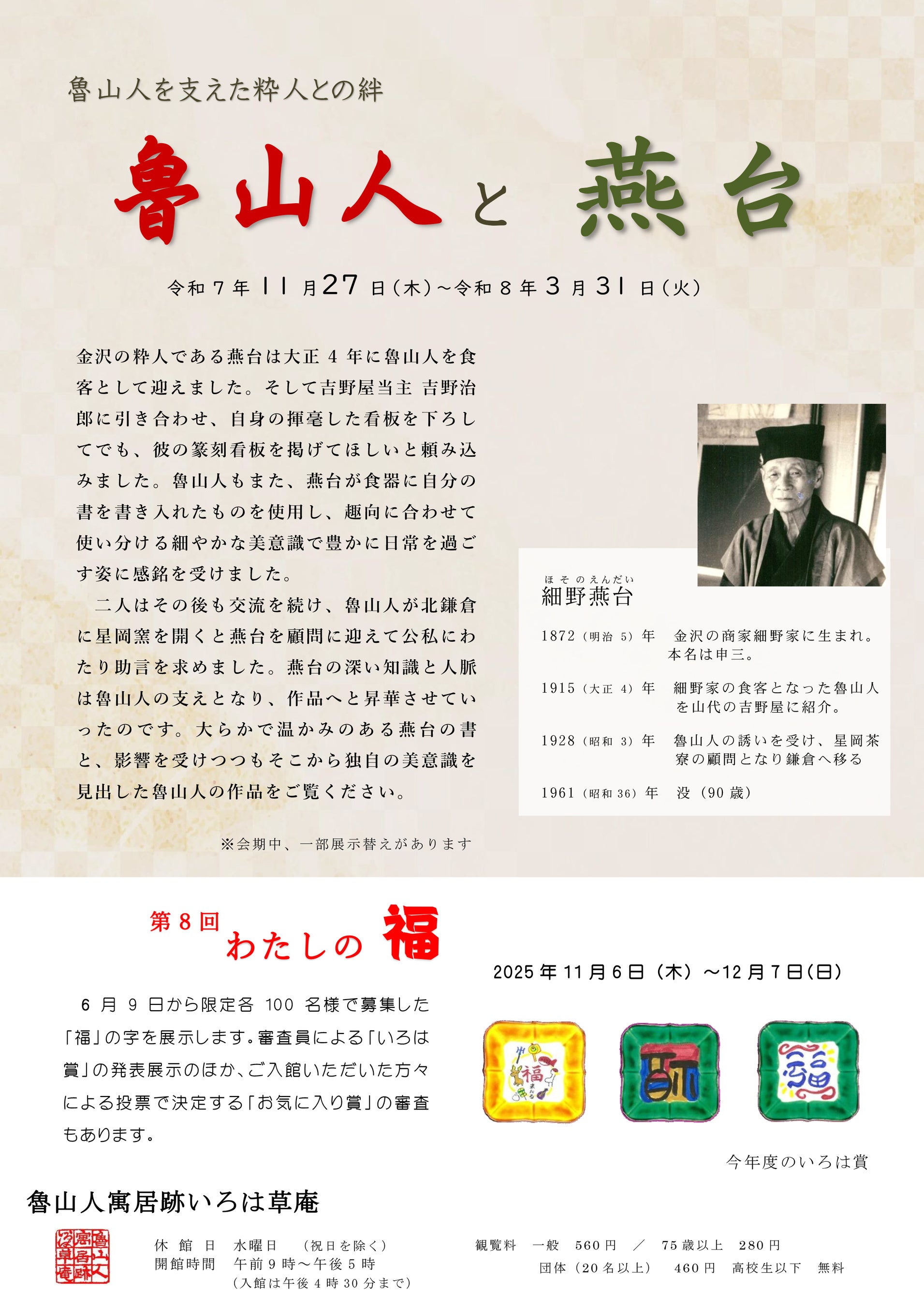 本展では、燕台の温かみと大らかさのある書と、影響を受けながらも独自の美意識を確立していった魯山人の作品を展示します。二人の間に結ばれた、深い敬愛と創造の絆をご堪能ください。