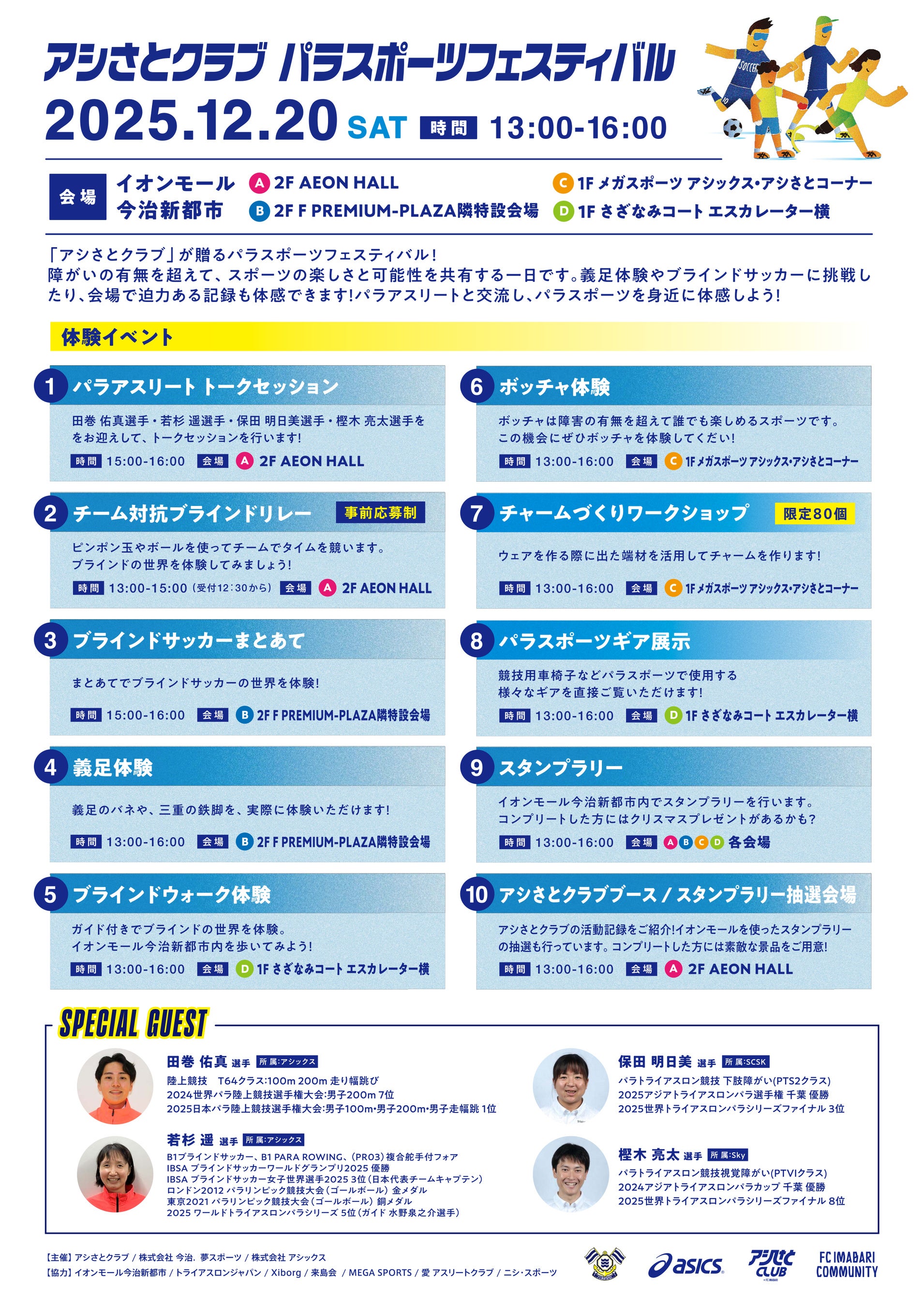 株式会社今治.夢スポーツ/FC今治は、株式会社アシックスと協働で運営する「アシさとクラブ」によるパラスポーツフェスティバルを2025年12月20日(土)にイオンモール今治新都市にて開催します。