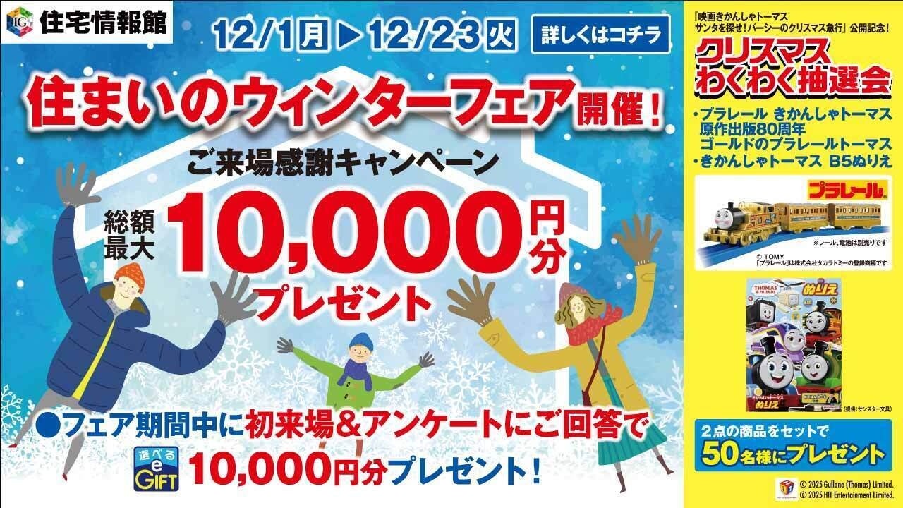 住宅情報館では「住まいのウィンターフェア」を開催中。フェアに合わせて子どもから大人まで大人気の『映画 きかんしゃトーマス サンタをさがせ!パーシーのクリスマス急行』との公開記念キャンペーン企画を実施しています。