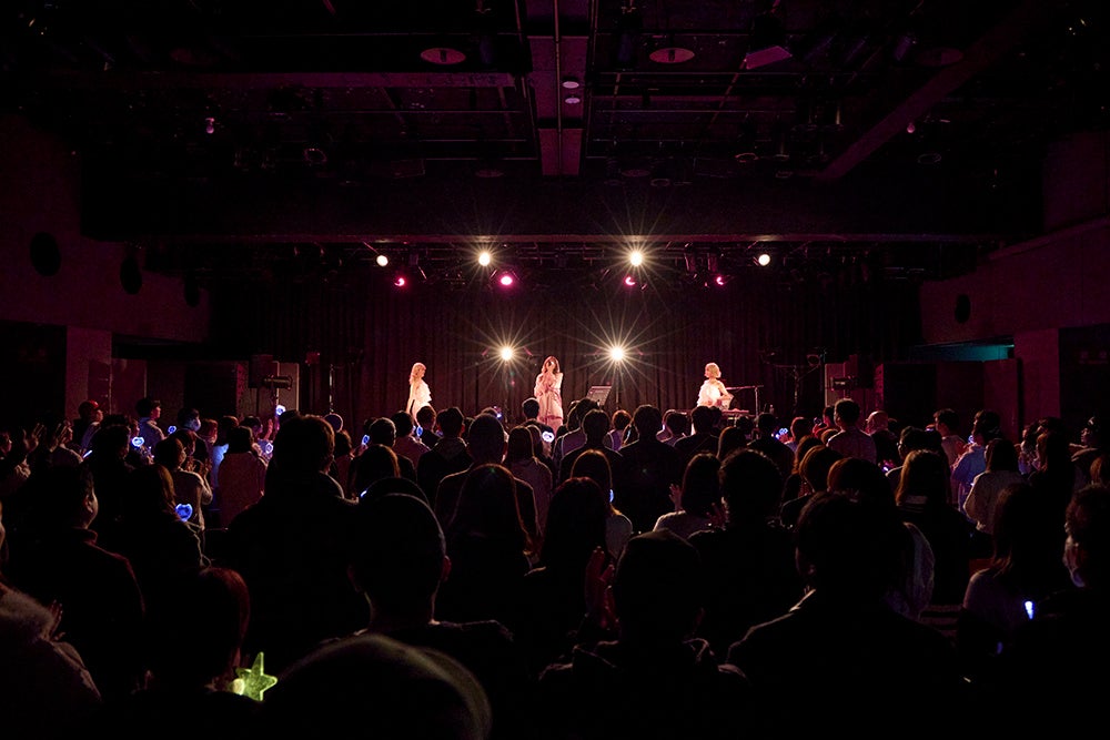 淡いピンク色のレースが印象的な衣装で姿を現すやいなや、「東京よろしくー!」とフランクに声かけ。肩の力が抜けた雰囲気で「LOVE MYSELF」を導いた。両親を思い描きながら《ママはいつも泣いてたね パパは最期逢えずに 今は一番星に》と口ずさんだかと思えば、《私が出来ることは 遠く彼方まで この声を届けること》と決意を固く刻みこむ。堂々とした佇まいは「今回のメインテーマがこれです」と言葉なく告げるよう。《愛するみんなへ》と差し伸ばされた手は穏やかで、一緒に未来を作っていく希望に溢れていた。とはいえ、甘く優しくだけでは行かないのがMACOスタイル。「盛り上がりが足りないんじゃない? 今から最終日だよ!」と焚きつけ、「初恋はいつも君と」へ。手元のリングライトを輝かせながら、少女のようにキラキラと瞳を輝かせる。「恋人同士」では舞台上にダンサーを呼びこみ、仲良くステップ。彼女たちに合わせて場内のサイリウムも左右に揺れ、一体感のある空気を作り出していた。