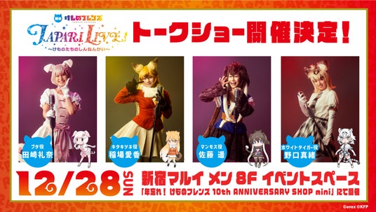 2025年12月27日(土)・28日(日)二日間開催の催事イベント「年忘れ! けものフレンズ 10th ANNIVERSARY SHOP mini」にて、「舞台けものフレンズ JAPARI LIVE! ~けものたちのしんねんかい~」(2026年1月15日(木)~18日(日)IMM THEATER(東京ドームシティ敷地内))出演キャストによるトークショーの開催が決定。
