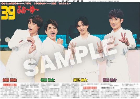 スポーツ報知を発行する報知新聞社(代表取締役社長・長谷川剛)は新聞の一部紙面をコンビニエンスストアのマルチコピー機からプリントできる「スポーツ報知コンビニプリント」サービスを展開中。スポーツ紙ならではの大きな写真を使った紙面をプリント版として販売しています。新たに12月12日付掲載、ふぉ~ゆ~が座長を務めるショー「ENTA!8 4U.Zepp in de SHOW」の取材会の紙面を発売中です。全員バージョンと各ソロバージョン5種類になります。