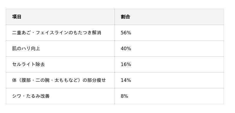- 効果に関する回答では、「二重あご・フェイスラインのもたつき解消」が56%で最多となり、「肌のハリ向上」が40%で続いた。