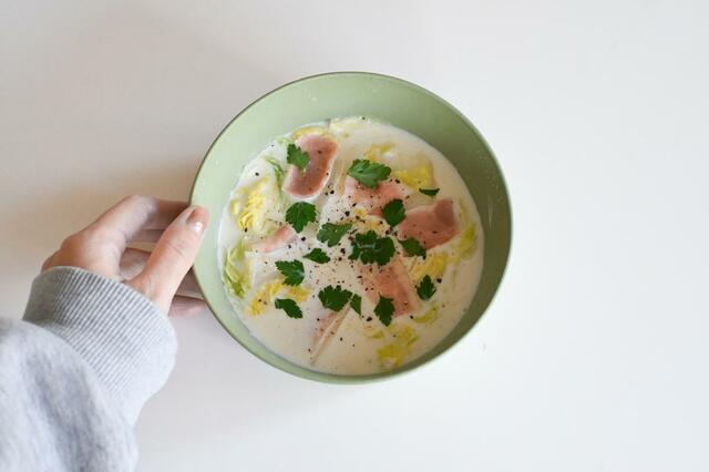 今回は公式レシピの中から「白菜と餅のミルクスープ」を作ってみたのですが、材料を容器に入れて、そのまま電子レンジにかけるだけなのでとっても手軽。