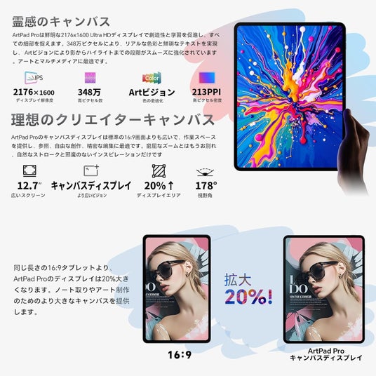 【アート視覚化 2K ディスプレイタブレット12インチ、スタイラスT-Pen付属】ArtPad Pro タブレット12.7インチの視覚性能は次元を超越。2176×1600 Ultra HD(348万画素/213PPI)を有するIPSフルラミネーション液晶は、従来の16:9画面比タブレットAndroidより20%広い表示領域を4:3アスペクト比で提供。