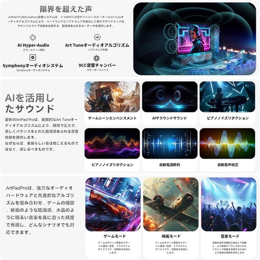 本 Android 15 タブレットはSymphonyサウンドシステムで音響革命を推進。Teclast独自開発のSymphonyサウンドシステムが、4基の9CC大口径二重磁気サーキットスピーカーとArt Tune Xアルゴリズムを連携。