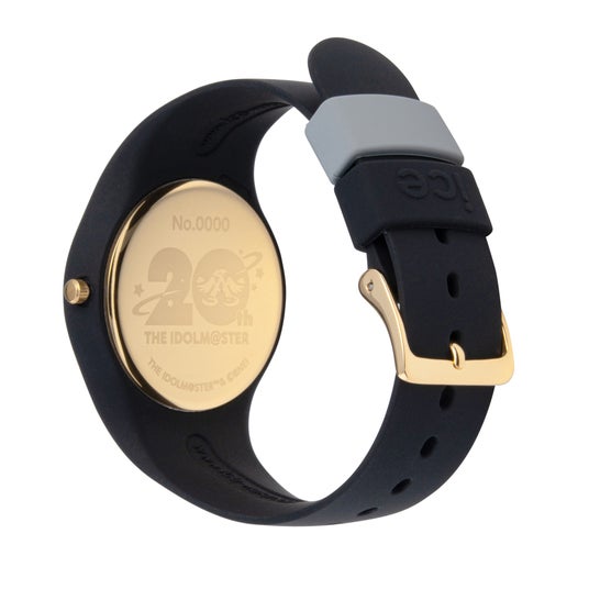 本体デザインは、765プロを起点に、各ブランドカラーのストーンをリリース年をイメージした間隔で配置。また、学園アイドルマスターと765プロの間には「あえて空白の間」を設け、まだ見ぬアイドルマスターの未来を象徴しています。裏蓋にはゴールドカラーのシリアルナンバー刻印を施し、特別感を演出。全体をブラックでまとめることでブランドカラーがより映え、男女問わず普段使いしやすいデザインに仕上げています。