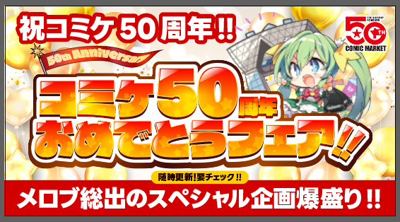 株式会社メロンブックスは12月30日から31日に開催予定のコミックマーケット107開催、またコミックマーケット50周年を記念し、50大キャンペーンの開催を行います。