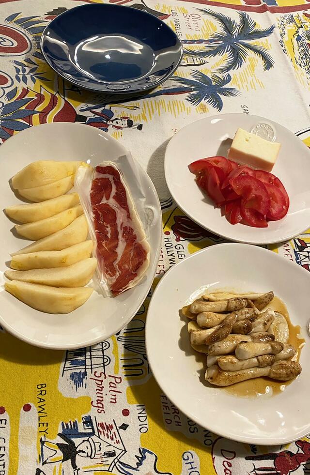 バターソテーにしてみました。ん、美味いぞこれ。儚い命のキノコとはいえ、意外に存在感のある食感と旨味。「うまい」「うまい」と言いながらペロリと食べてしまいました。ハモン・イベリコとトマト、タッレージョ(イタリアのチーズ)。