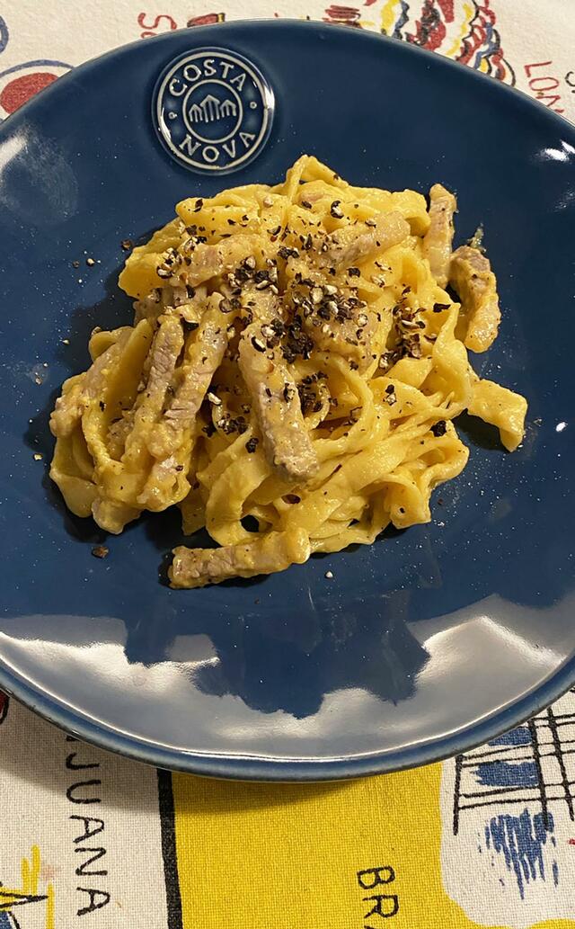 そしてアロマフレスカ原田シェフのレシピ:豚バラ肉で作る「カルボナーラ」。これまたうまし! 超簡単で超うまし!