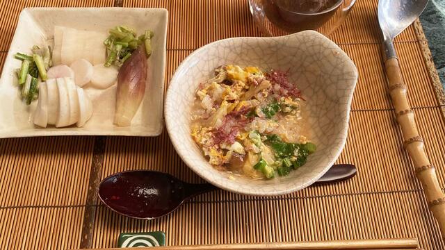 昨夜の牡蠣鍋で残ったスープにコンビーフとご飯を入れて、卵雑炊に。ああ、なんで、どうして、鍋物後の卵雑炊は、こんなに美味しいの? 3回お代わりしました。食欲復活です。ぬか漬け、ル・レクチェ。