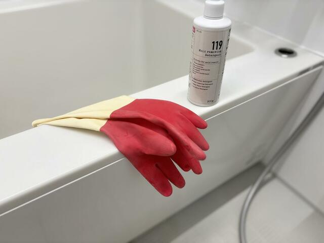 万が一付いても気にならない服を着用し、ゴム手袋と念のため眼鏡も装着して、いざカビ退治。