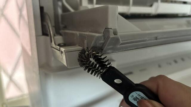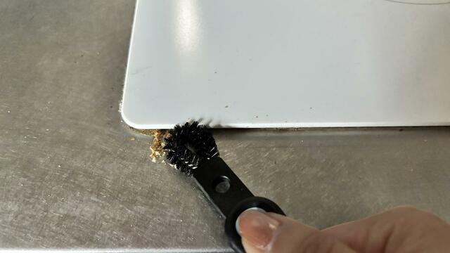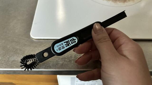 大体の汚れが取れたあとに反対側のブラシでこすると、ふちの中までブラシが入り込み、よりスッキリ汚れを落とすことができます。狭いすき間に溜まった頑固な汚れも簡単に掻き出せました。