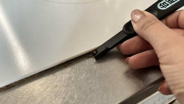 使い方は簡単で、油汚れや焦げが混ざった黒ずみ汚れが気になるところをヘラでなぞっていくだけ。先端が薄く、適度な硬さがあるため、ゴシゴシ擦らず軽くなぞるだけでも汚れがポロッと剥がれます。