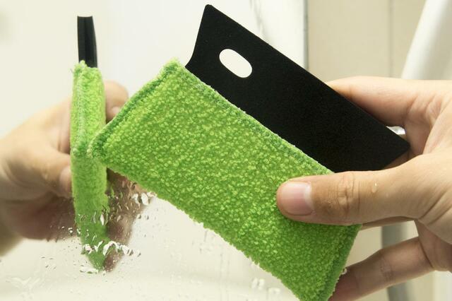 使い方は簡単! お掃除したい部分を水で濡らして、緑色の面でこすり洗いしてスキージーで水を切るだけ。