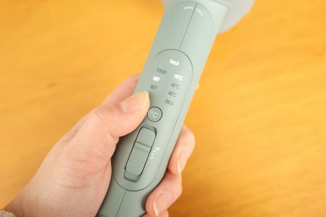 風量は「SET・DRY・TURBO」の3段階、温度は「COLD・45℃・60℃・90℃」の4段階から選べて、組み合わせはなんと全部で12個のモード。
