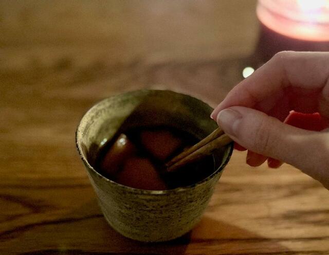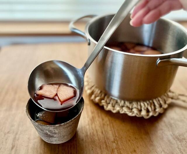 おたまでカップに注げば、特別な冬の一杯に。ワイン多めでドリンクとしても、フルーツたっぷりでデザート感覚でも楽しめますよ。