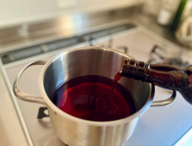 沸騰させるとアルコールが飛んでしまうため、弱火で沸騰直前まで加熱します。