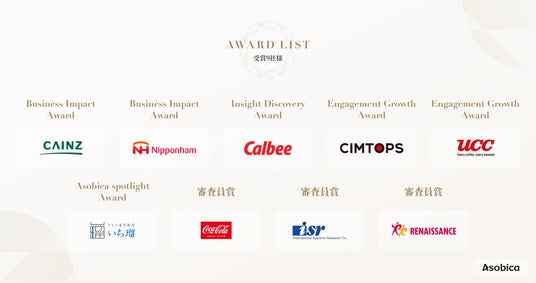 ファンとの商品共創で前年比110%の販売数を記録したカルビー株式会社(Insight Discovery Award)や、コミュニティ活用で年間数億円規模のLTV向上を実現した株式会社カインズ(Business Impact Award)など、顧客の声もとにビジネスの成果に繋げた計9社を選出しました。