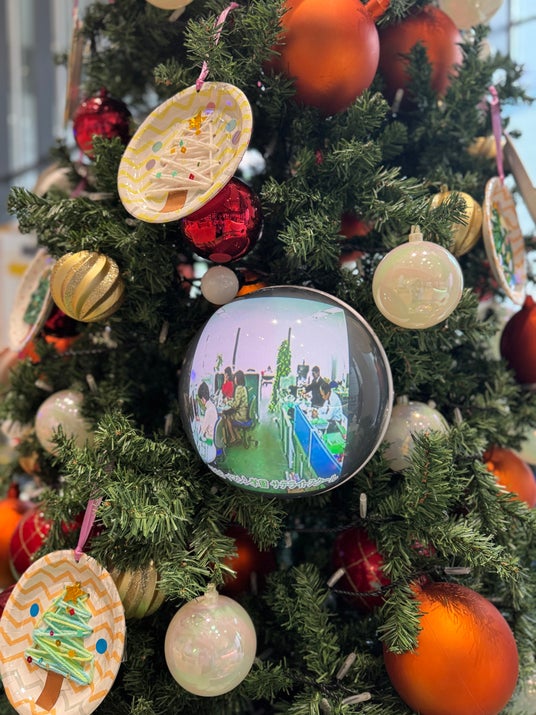 Gakkenこどもえんの園児たちが手作りしたオーナメントもツリーを彩り、温かいムードを添えています。
