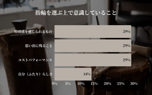 特に、「アフターサービス」が「デザイン」と同じ割合で選ばれたことは、結婚指輪を一生ものとして考え、購入後のメンテナンスやサポート体制に高い価値を置いていることを裏付けています。