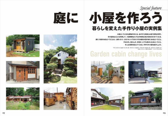 巻頭記事は「庭に小屋を作ろう 暮らしを変えた手作り小屋の実例集」と題し、家主が自ら庭に作った9棟の小屋を紹介しています。それら9棟の小屋は、もちろん目的もデザインも構造もさまざま。目的の例を挙げるなら、植物を愛でるリラックススペースとして建てたもの、屋外のようにラフに調理できる飲食スペースとして建てたもの、夫妻の趣味スペースとして建てたもの、囲炉裏を楽しむために建てたもの、リモートワークのオフィスとして建てたものなどがあり、デザインや構造の例を挙げるなら、大きな窓と土間を備えるもの、既設のウッドデッキと母屋の外壁を利用したもの、柱や梁に丸太を使ったもの、ロフトを備えたハイルーフのもの、4平方メートル少々の床面積ながら薪ストーブを備えたものなどがあります。
