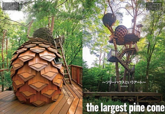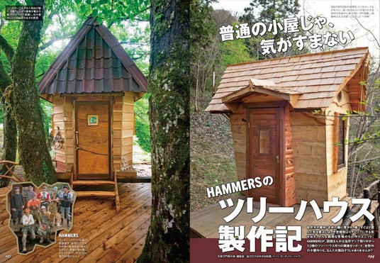 巻末記事は、特徴が際立つ小屋の第2弾、ツリーハウスがテーマです。子どもの頃に憧れた人も多いであろうツリーハウスは、大人にとってもやはりワクワクせずにはいられない魅惑の小屋。本書では、もの作り集団「HAMMERS」が、自然木や古材を使い、絵本から飛び出してきたような愛嬌のあるツリーハウスを製作する模様をリポートするとともに、ひと目見ただけで引き込まれる、もはやアートともいえる松ぼっくり型のツリーハウスを紹介。