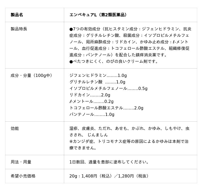 このたび、「エンペキュア」の処方を新たに検討、有効成分を追加・増量し、「エンペキュアL」としてリニューアルしました。今回のリニューアルでは、従来品であるエンペキュアより抗炎症成分・殺菌成分を増量し、荒れた患部の修復を助ける成分を追加。また、清涼感を与えかゆみを和らげるリットル-メントールも新配合しています。