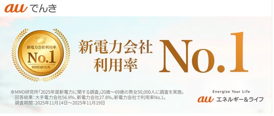 auエネルギー&ライフ株式会社(本社:東京都千代田区、代表取締役社長:齋藤 茂、以下:auエネルギー&ライフ)が提供する「auでんき」は、MMD 研究所が実施した「2025年新電力に関する調査」において、利用している新電力会社で1位を獲得しました。