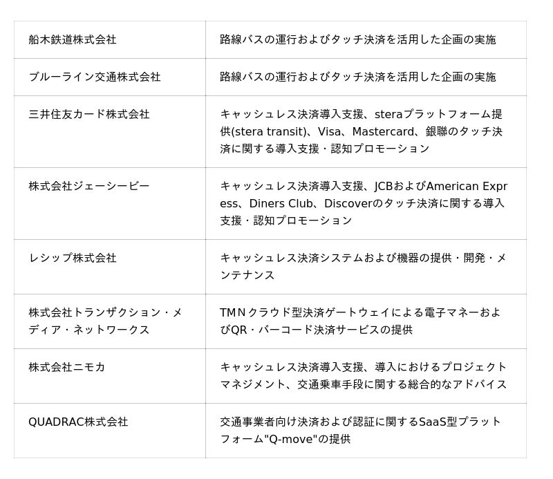船木鉄道株式会社(本社:山口県宇部市、代表取締役社長:田中 敬一、以下:船鉄バス)、ブルーライン交通株式会社(本社:山口県下関市、代表取締役社長:伊藤 修、以下:ブルーライン交通)、三井住友カード株式会社(本社:東京都江東区、代表取締役 社長執行役員CEO:大西 幸彦、以下:三井住友カード)、株式会社ジェーシービー(本社:東京都港区、代表取締役会長兼執行役員社長:二重 孝好)、レシップ株式会社(本社:岐阜県本巣市、代表取締役社長:北野 元昭)、株式会社トランザクション・メディア・ネットワークス(本社:東京都中央区、代表取締役社長:大高 敦、以下TMN)、株式会社ニモカ(本社:福岡県福岡市、代表取締役社長:田端 敦)、QUADRAC株式会社(本社:東京都中央区、代表取締役社長:高田 昌幸、以下:QUADRAC)は、2026年2月2日(月)より、船鉄バスおよびブルーライン交通が運行する路線バスにおいて、三井住友カードの公共交通機関向けソリューション「stera transit」を活用したクレジットカード等(※)のタッチ決済による乗車サービスを開始します。あわせて、TMNの決済ゲートウェイサービスを活用し、電子マネーおよびQR・バーコード決済の対応を開始します。