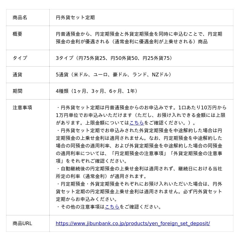 「円外貨セット定期」は、円定期預金と外貨定期預金がセットとなった商品で、満期まで保有することで、円定期預金の金利を上乗せして提供します。預入金額は10万円から、1万円単位でお申込み可能です(注1)。 預入期間は1ヶ月、3ヶ月、6ヶ月、1年の4種類から、対象通貨は米ドル、豪ドルをはじめ、ユーロ、NZドル、南アフリカランドの5通貨から選択することができます。