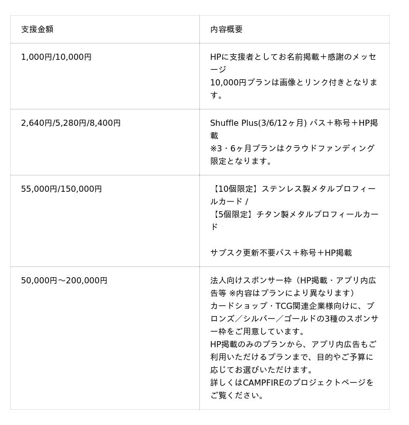 支援者としてのHP掲載やアプリ内称号、メタルプロフィールカード、高額スポンサー枠など、さまざまなコースをご用意しています。