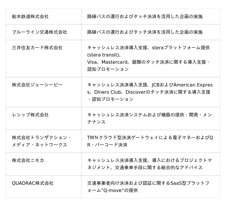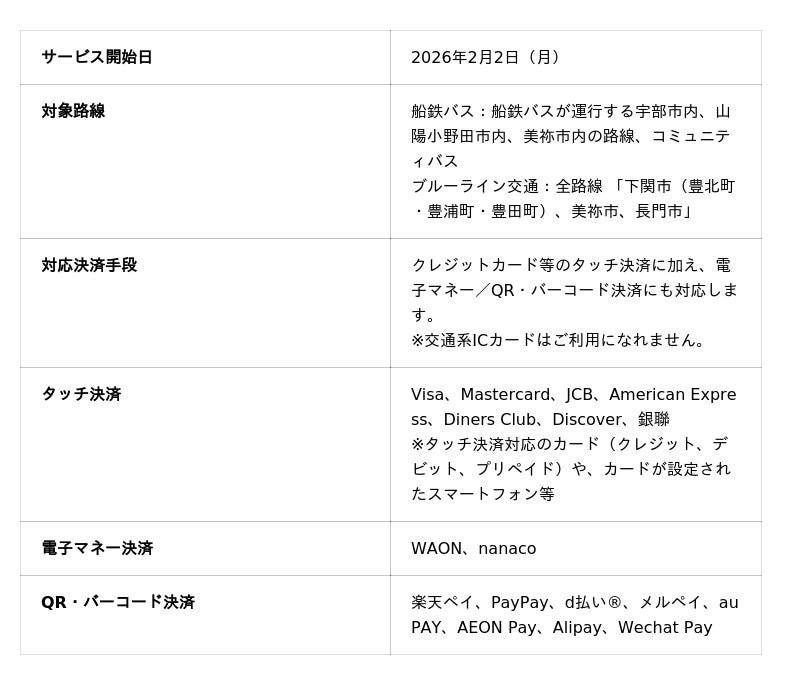 船木鉄道株式会社(本社:山口県宇部市、代表取締役社長:田中 敬一、以下:船鉄バス)、ブルーライン交通株式会社(本社:山口県下関市、代表取締役社長:伊藤 修、以下:ブルーライン交通)、三井住友カード株式会社(本社:東京都江東区、代表取締役 社長執行役員CEO:大西 幸彦、以下:三井住友カード)、株式会社ジェーシービー(本社:東京都港区、代表取締役会長兼執行役員社長:二重 孝好)、レシップ株式会社(本社:岐阜県本巣市、代表取締役社長:北野 元昭)、株式会社トランザクション・メディア・ネットワークス(本社:東京都中央区、代表取締役社長:大高 敦、以下TMN)、株式会社ニモカ(本社:福岡県福岡市、代表取締役社長:田端 敦)、QUADRAC株式会社(本社:東京都中央区、代表取締役社長:高田 昌幸、以下:QUADRAC)は、2026年2月2日(月)より、船鉄バスおよびブルーライン交通が運行する路線バスにおいて、三井住友カードの公共交通機関向けソリューション「stera transit」を活用したクレジットカード等(※)のタッチ決済による乗車サービスを開始します。あわせて、TMNの決済ゲートウェイサービスを活用し、電子マネーおよびQR・バーコード決済の対応を開始します。