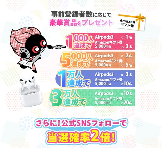 - 30,000人達成時:AirPods 3(10名様) / Amazonギフト券5,000円分(20名様)