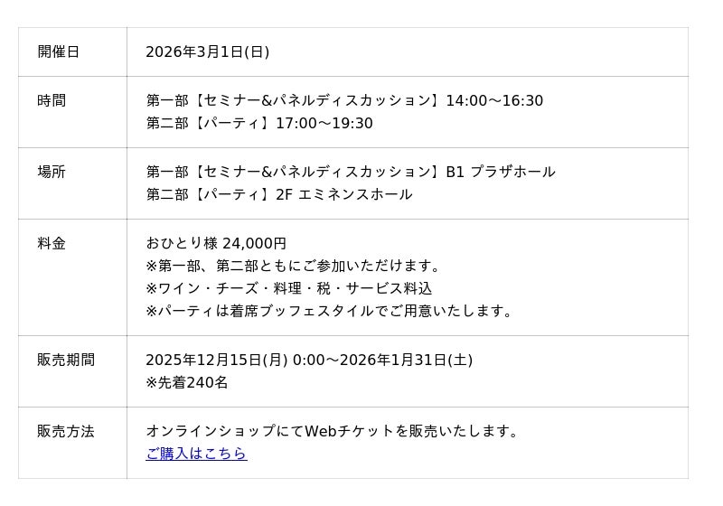 さらに、セミナー&パネルディスカッションでは、コーディネーターに「日本ワインの母」とも呼ばれる、一般社団法人 日本ワインブドウ栽培協会(JVA) 代表理事の鹿取みゆき氏を迎え、第一線で活躍する生産者のワイン造り・チーズ造りの生の声に触れることができます。