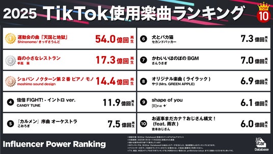 上位には、ダンス楽曲ではなく、動画の演出効果を高めるBGMが並びました。音源は、動画のオチや感情表現を補完する“演出装置”として機能しており、TikTokにおける音楽消費の変化が顕著に表れています。