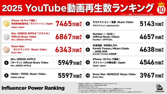 インフルエンサーマーケティングプラットフォームを中心とした様々な事業を展開する株式会社BitStar(本社:東京都渋谷区、代表取締役 社長執行役員CEO:渡邉拓)は、インフルエンサーマーケティングプラットフォーム「BitStar Database」のデータに基づき、2025年(集計期間:1月1日~11月30日)に活躍した動画クリエイター、チャンネル、PR投稿のランキングを発表しました。